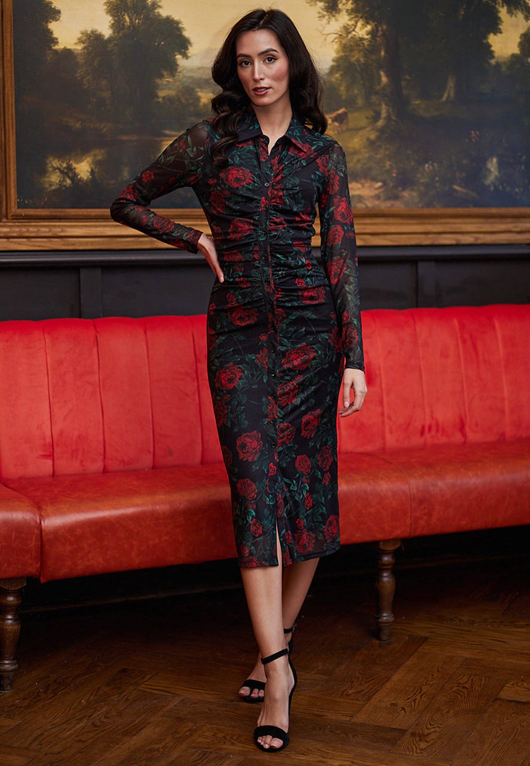 Rock autumnal florals in the Bodycon Shirt Dress with Mesh Sleeves Black Rose Print by ANGELEYE. This long sleeve, mesh dress with ruching detail is designed to flatter. Transition in style with this gorgeous print in the season's coolest colour, red. Pair with heels for evening plans or dress down for work.