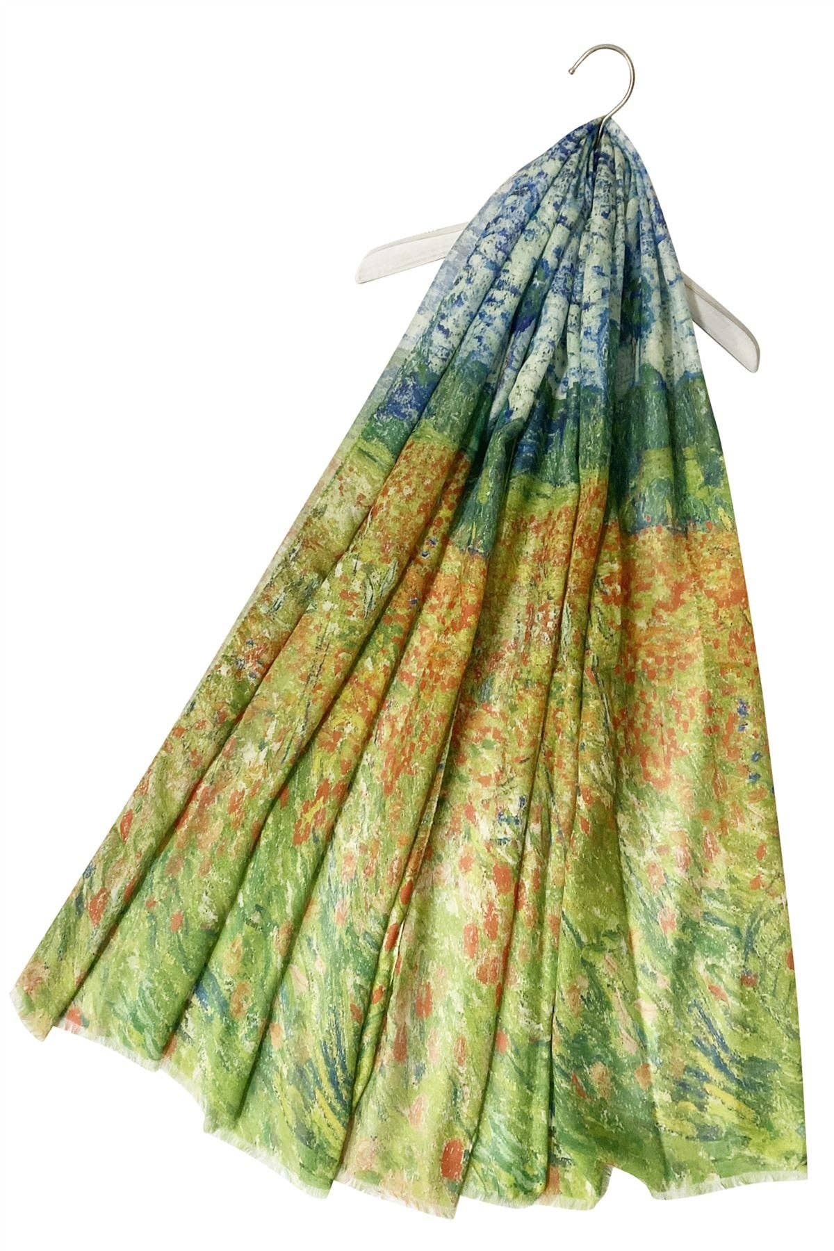 The Van Gogh Poppy Field Print Scarf is a stunning and unique accessory that features a beautiful green and poppy print inspired by Vincent Van Gogh's "Poppy Field."