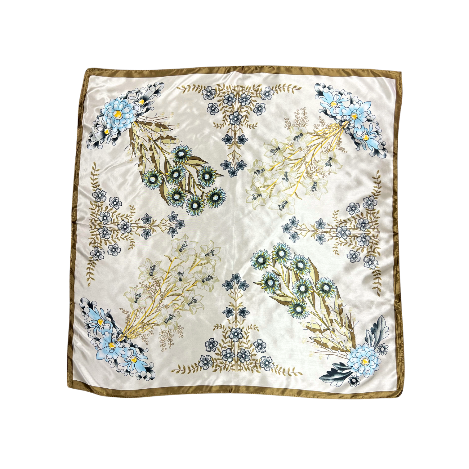 Beautiful silky satin square scarf with multi-floral print. The scarf can be worn around the neck, head, and shoulder.