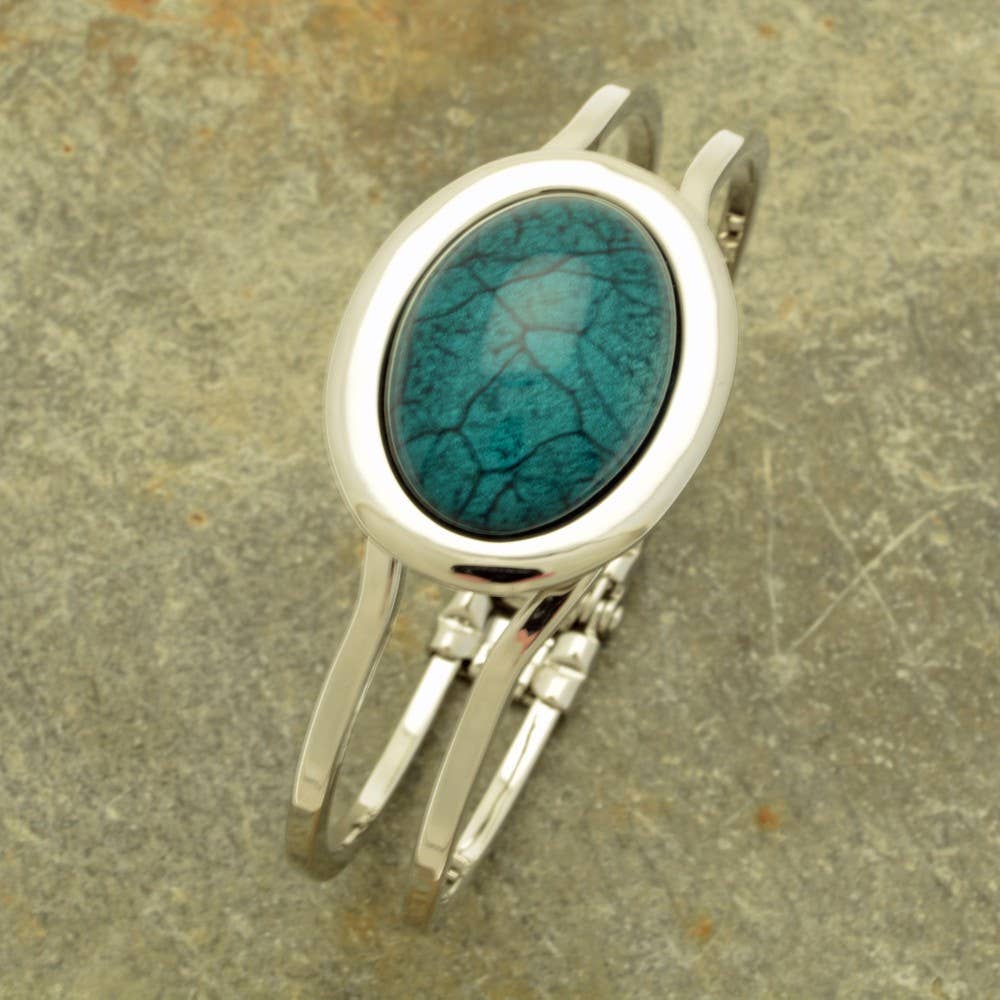 This forest green bangle is our most popular style of bracelet and uses a resin backed with marbled paper, which gives it an illusion of depth and texture. It has a hinged clasp making it a universal fit. The oval decoration measures approx 3cm by 2.5cm.