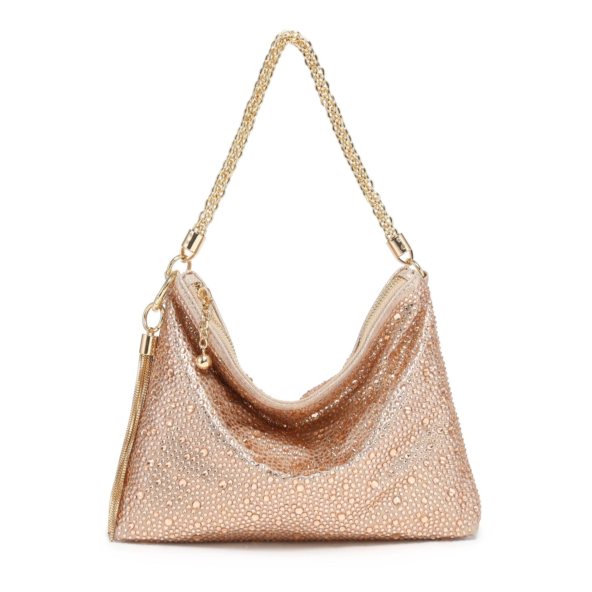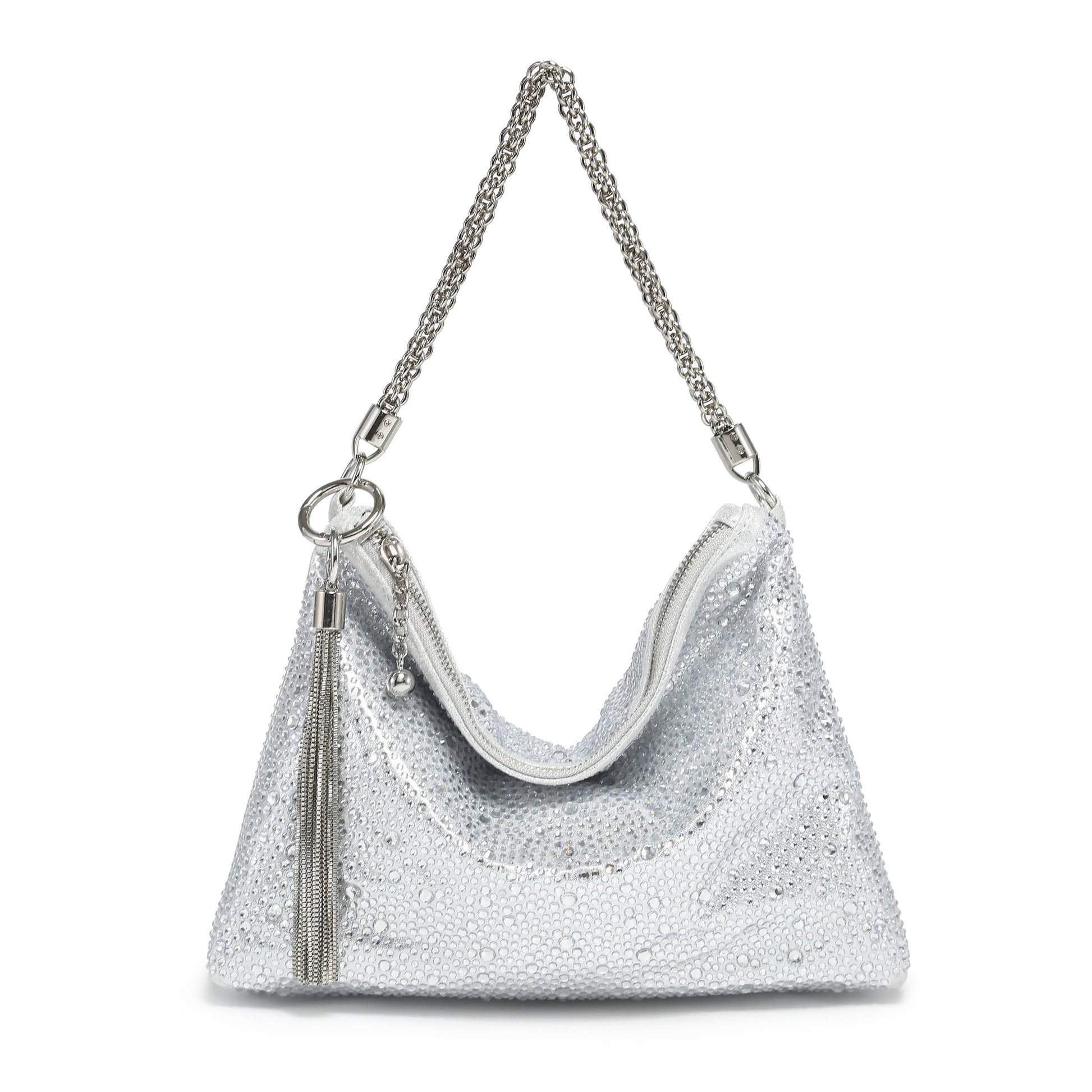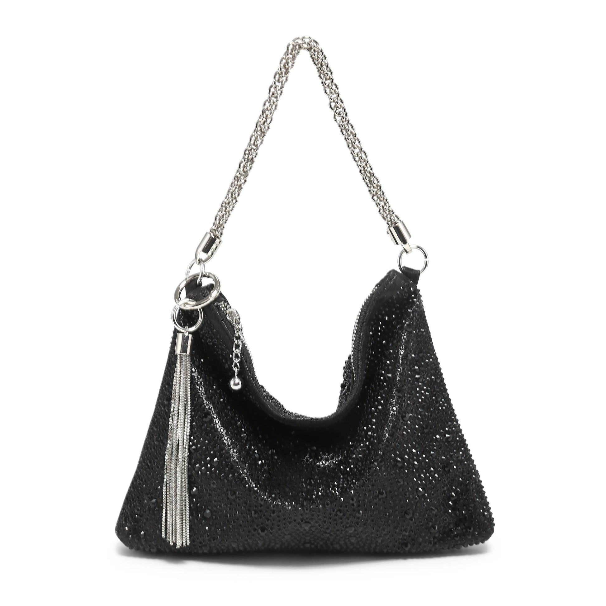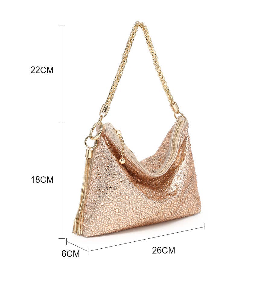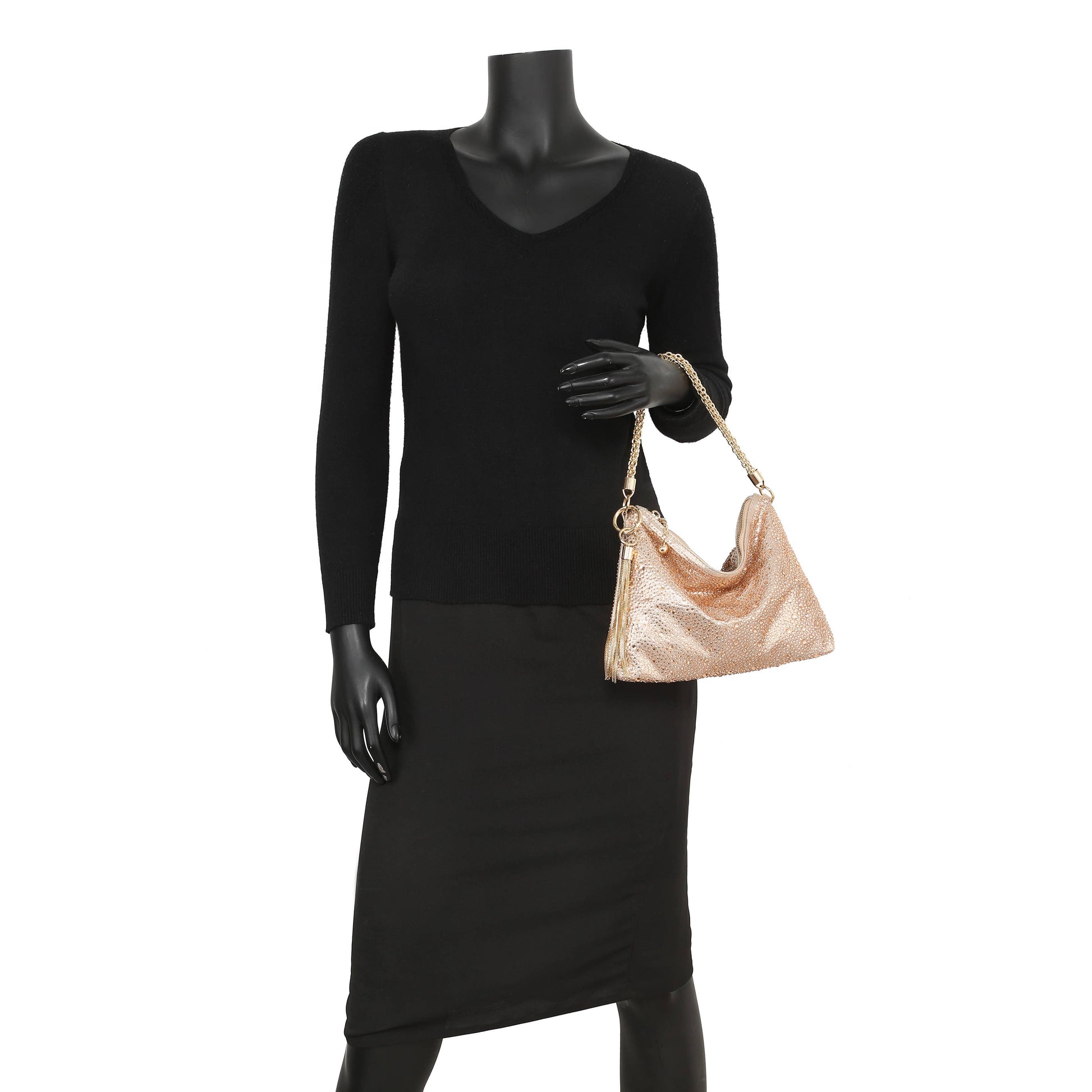 Soft Double Side Diamante Bag with Fringe and Zip Top Closure.
